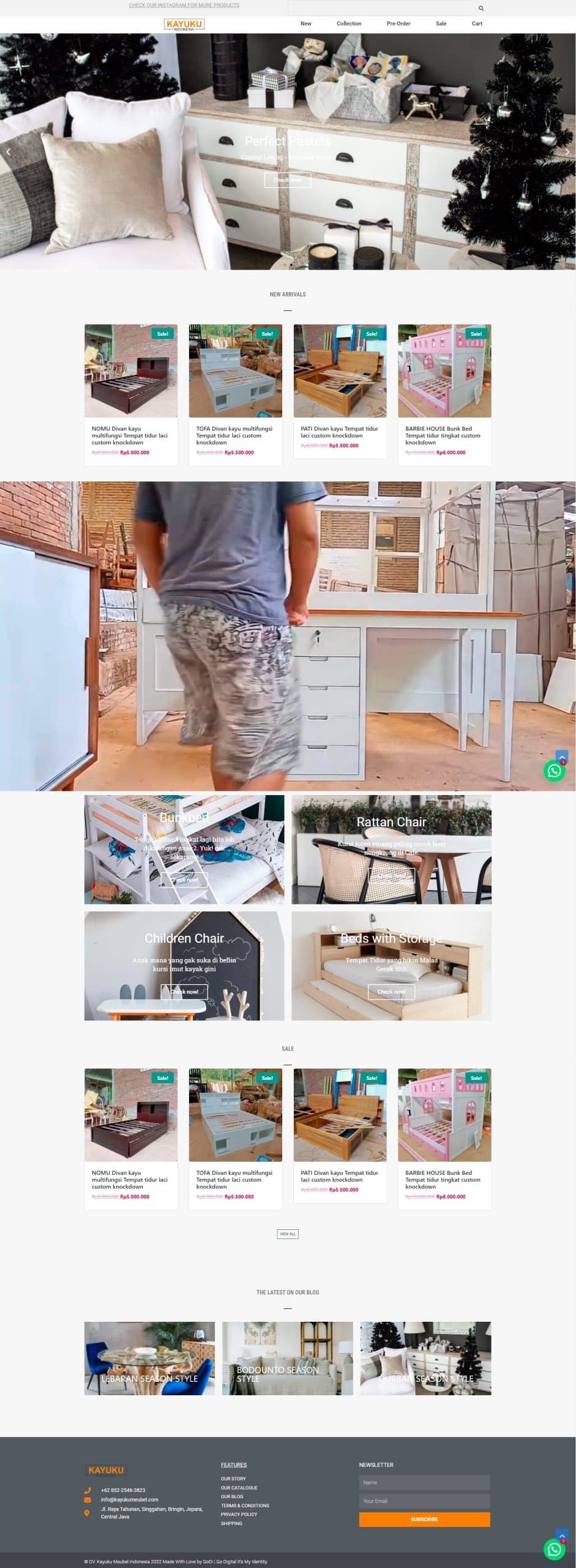 Kayuku Meubel ‘s website features a modern design and focuses on selling functional wooden furniture, especially custom products such as multifunctional wooden divans, knockdown drawer beds, and bunk beds. Here are some of the main features of the site: