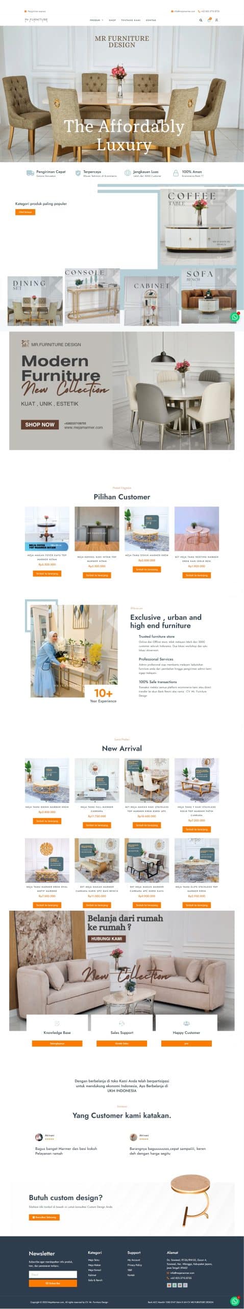 - Hero Image: Bagian atas halaman memperlihatkan gambar furnitur marmer berkualitas tinggi, yang langsung menarik perhatian pengunjung dengan kesan eksklusif. Warna dominan adalah putih, abu-abu, dan emas, memperkuat tema elegan dan premium dari produk yang dijual.